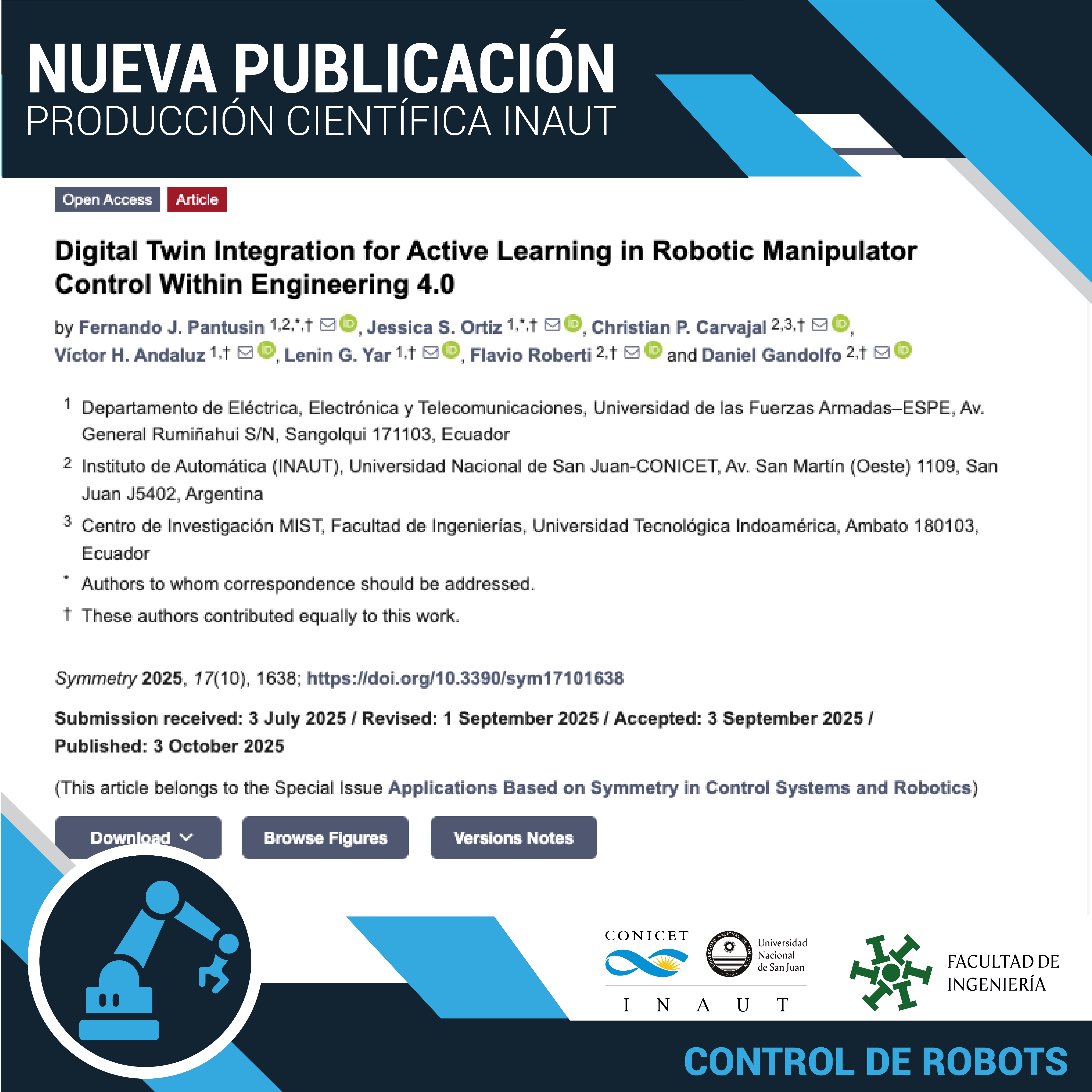Investigadores del INAUT (CONICET – UNSJ), junto a universidades de Ecuador, desarrollaron una plataforma basada en gemelos digitales que optimiza la enseñanza y validación de estrategias de control en manipuladores robóticos