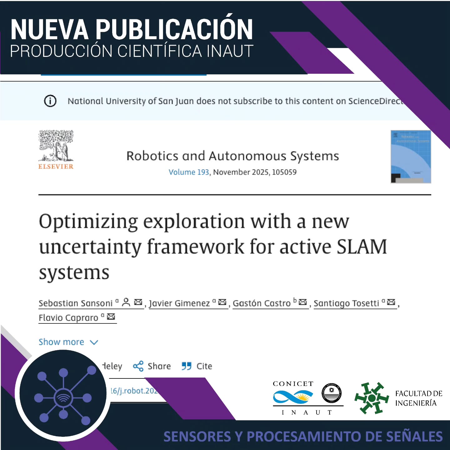 Investigadores de la línea de Sensores y Procesamiento de Señales del Instituto de Automática (INAUT, CONICET–UNSJ), en colaboración con el Centro Internacional Franco Argentino de Ciencias de la Información y de Sistemas (CIFASIS), publicaron un nuevo trabajo científico que propone un enfoque innovador para mejorar la exploración y la evaluación de la calidad del mapeo en sistemas Active SLAM.